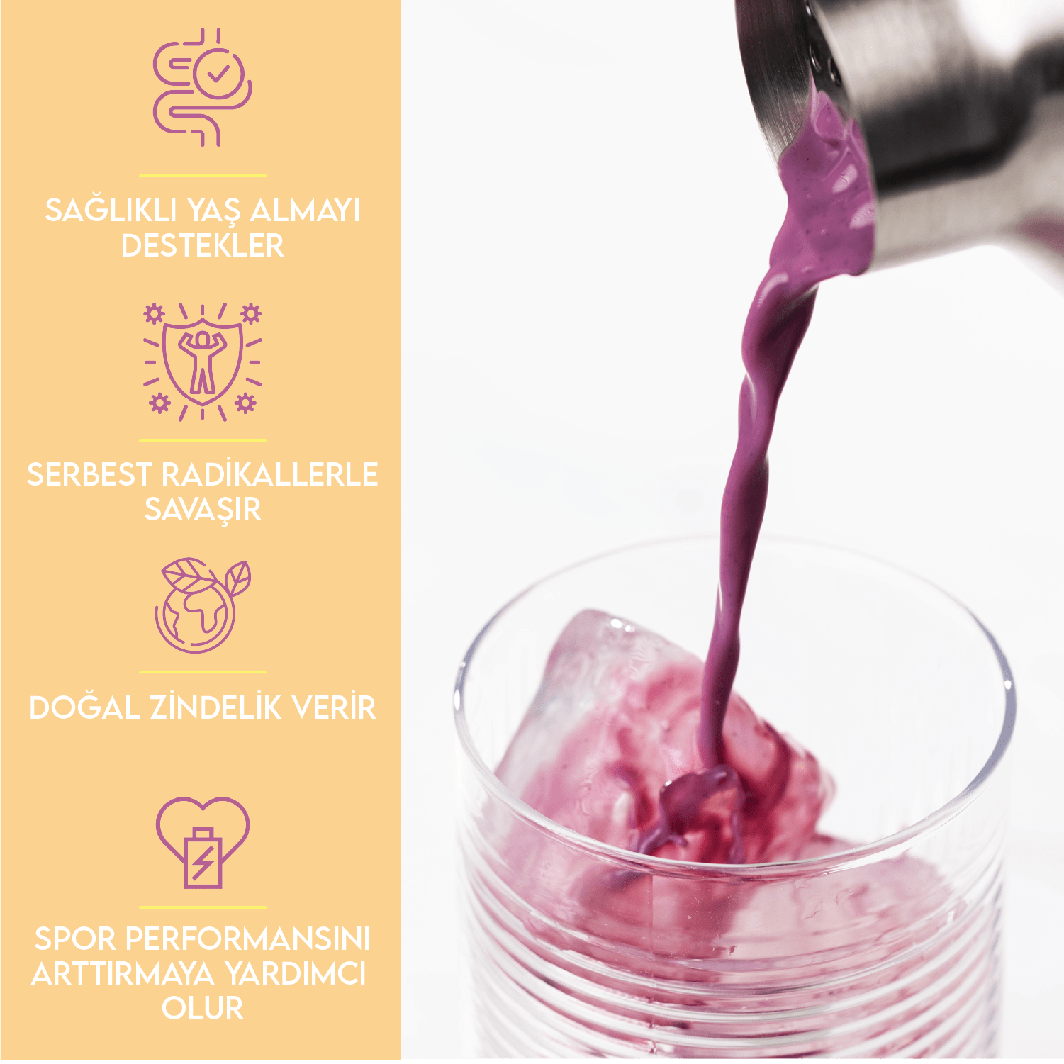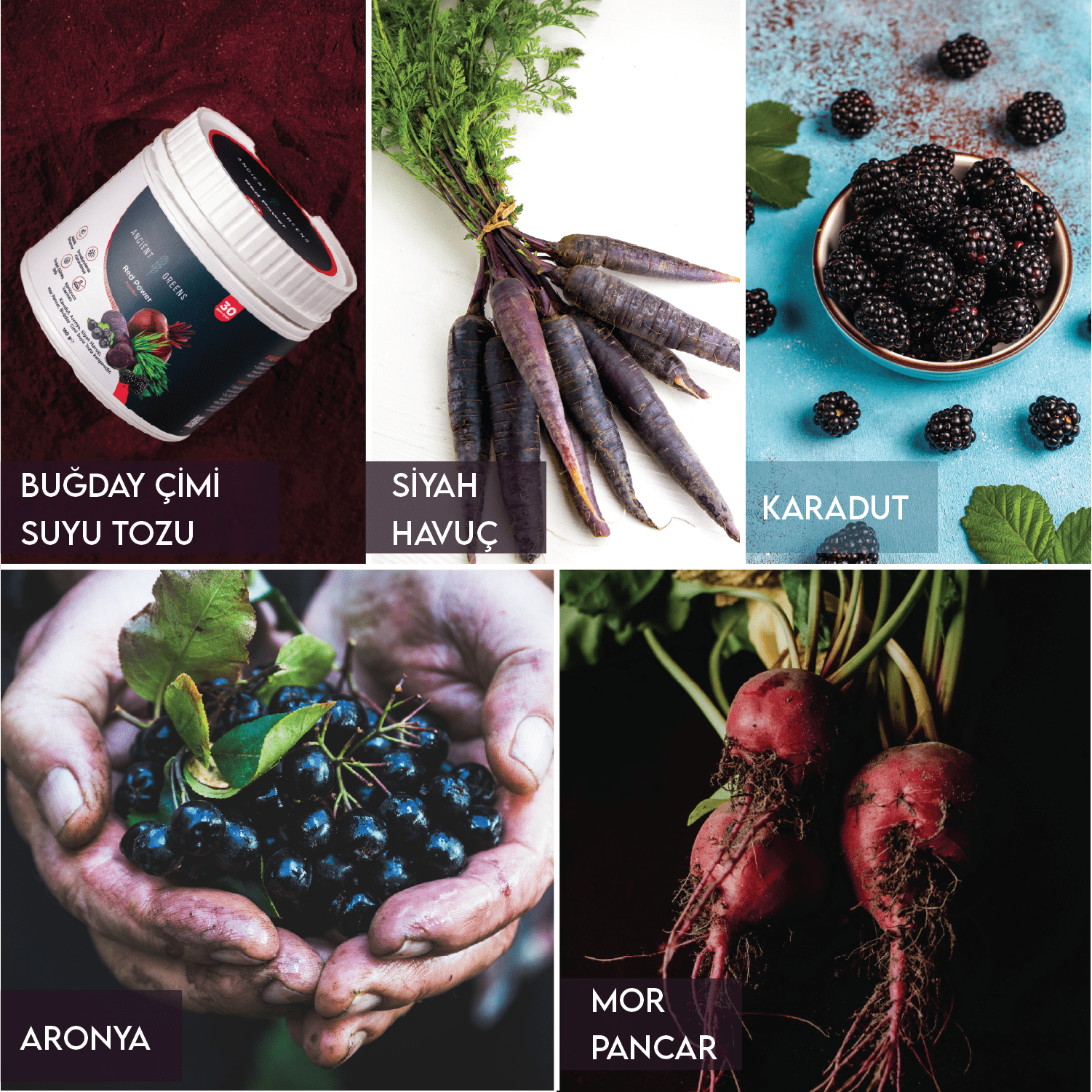- Ingredients: Black Mulberries, aronia berries, beetroot, purple carrot, wheatgrass juice powder